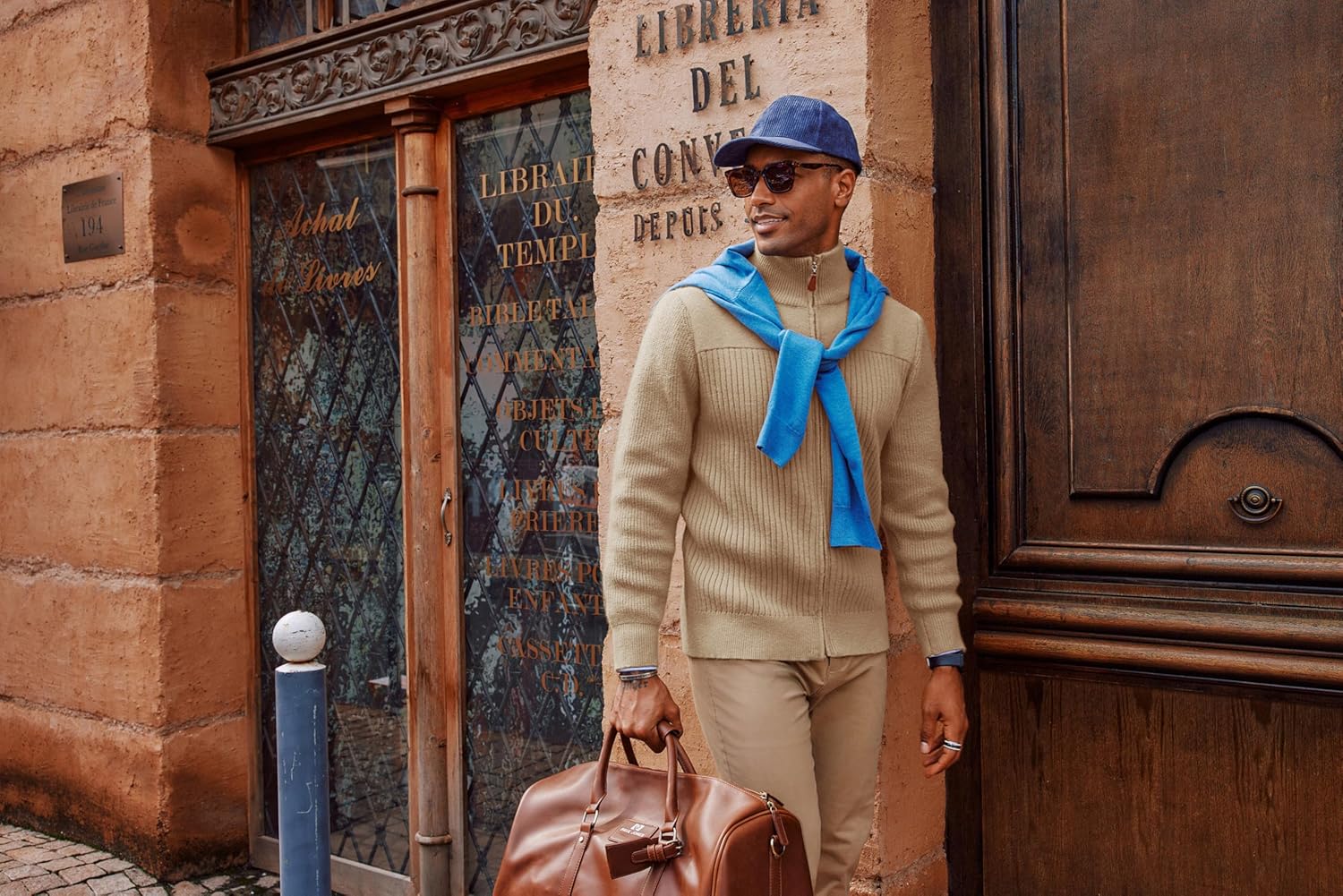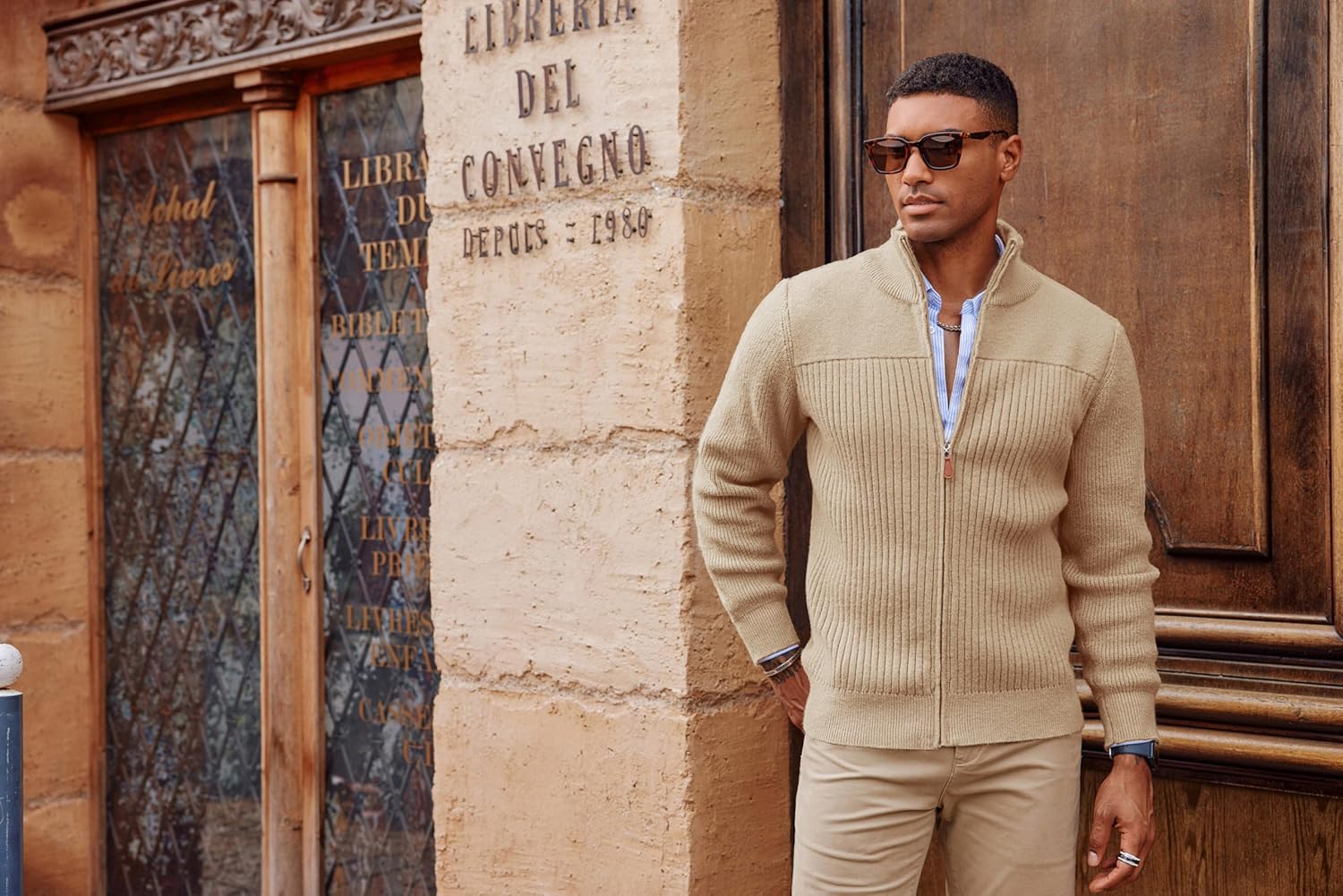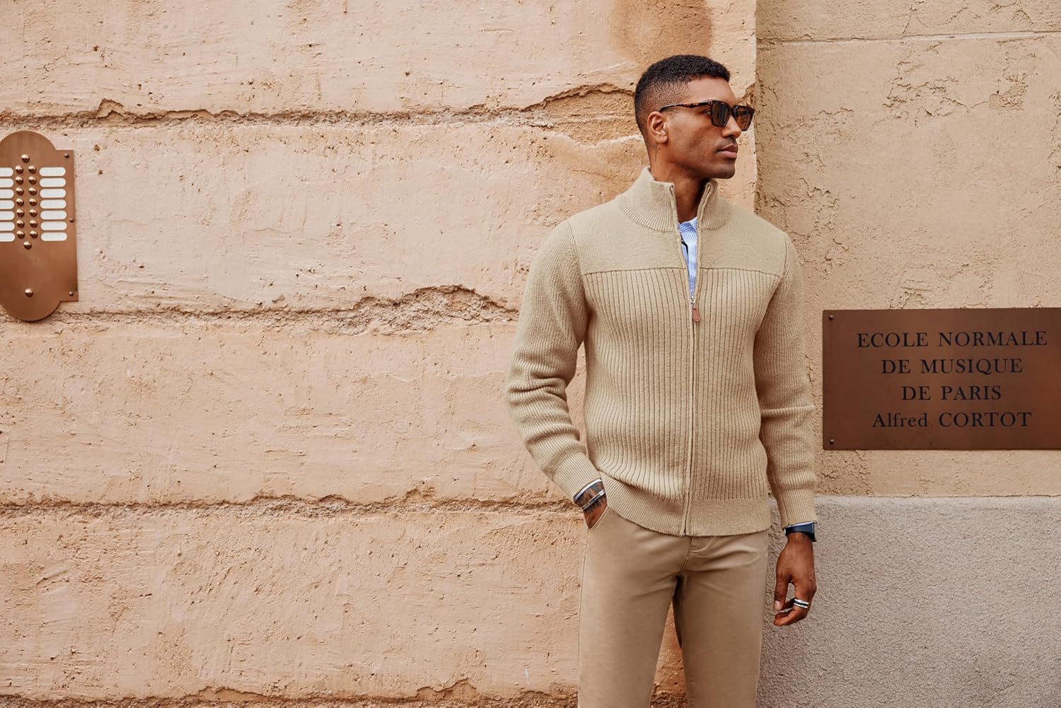 PJ PAUL JONES Mens Full Zip Cardigan Sweater Casual Stand Collar Ribbed Knitted Cardigan Long Sleeve Textured Sweater Cardigans Khaki L